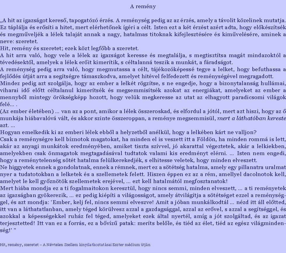 | Kedves Vendégem! Az új év kezdetén sokszor elgondolkodunk azon, hogy vajon mit hoz az idei év? Van, aki aggódva és pesszimistán néz a jövőbe, és van, aki reménykedve, hogy talán most jobb lesz, mint tavaly! A remény nagyon fontos lelki kincsünk, amit ápolnunk, erősítenünk kell, különösen a nehéz időszakokban. Ezért választottam újévre egy, a reményről szóló szép tanítást, hogy ez adjon erőt az új esztendőhöz, bármit is hozzon az. Ezzel kívánok mindenkinek békés, boldog új esztendőt! |