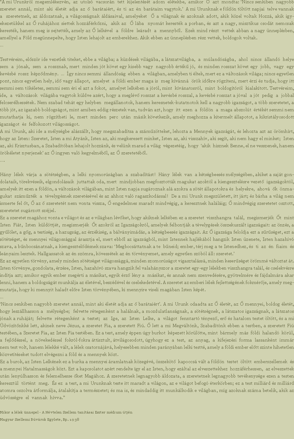 | Kedves Vendégem! A feltámadás ünnepe kapcsán a Névtelen Szellem egyik gyönyörű tanítását szeretném idézni, amely - a tőle megszokott mélységekkel - világít rá a megváltás szellemi tartalmára. Ezzel kívánok minden kedves Olvasómnak emelkedett, békés húsvéti ünnepeket! |